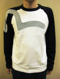 おもろさと本気さを売りに十数年で世界を席巻する迄に成長した関西を代表するカジュアルブランド、エヴィス。不動の人気を誇るジーンズのみならずトータルアイテムを展開していて、この長袖Tシャツはエヴィスのアイコン“カモメ”を大胆な構図で配した一目でエヴィスだと分かるデザインです。単なるデザインとしてだけではなく、袖と身頃を合わせる縫い目を無視して胸から右袖にかけてカモメの形に刳り貫き、配色の同素材をはめ込んだ国内では縫製してくれる工場を確保する事が難しい仕様です。更に肉厚の天竺を使いリブも捻り付けにする等凝った縫製仕様のボディを使ってもこの価格で押さえる為、敢えて中国生産にしています。綿100%、MADE IN CHINA、サイズは38(身幅:51cm着丈:65cm袖丈:85cm)40(身幅:53cm着丈:66cm袖丈:88cm)の2サイズです。